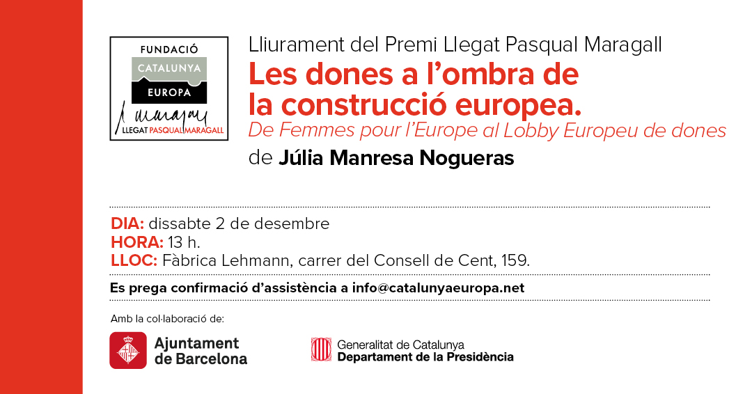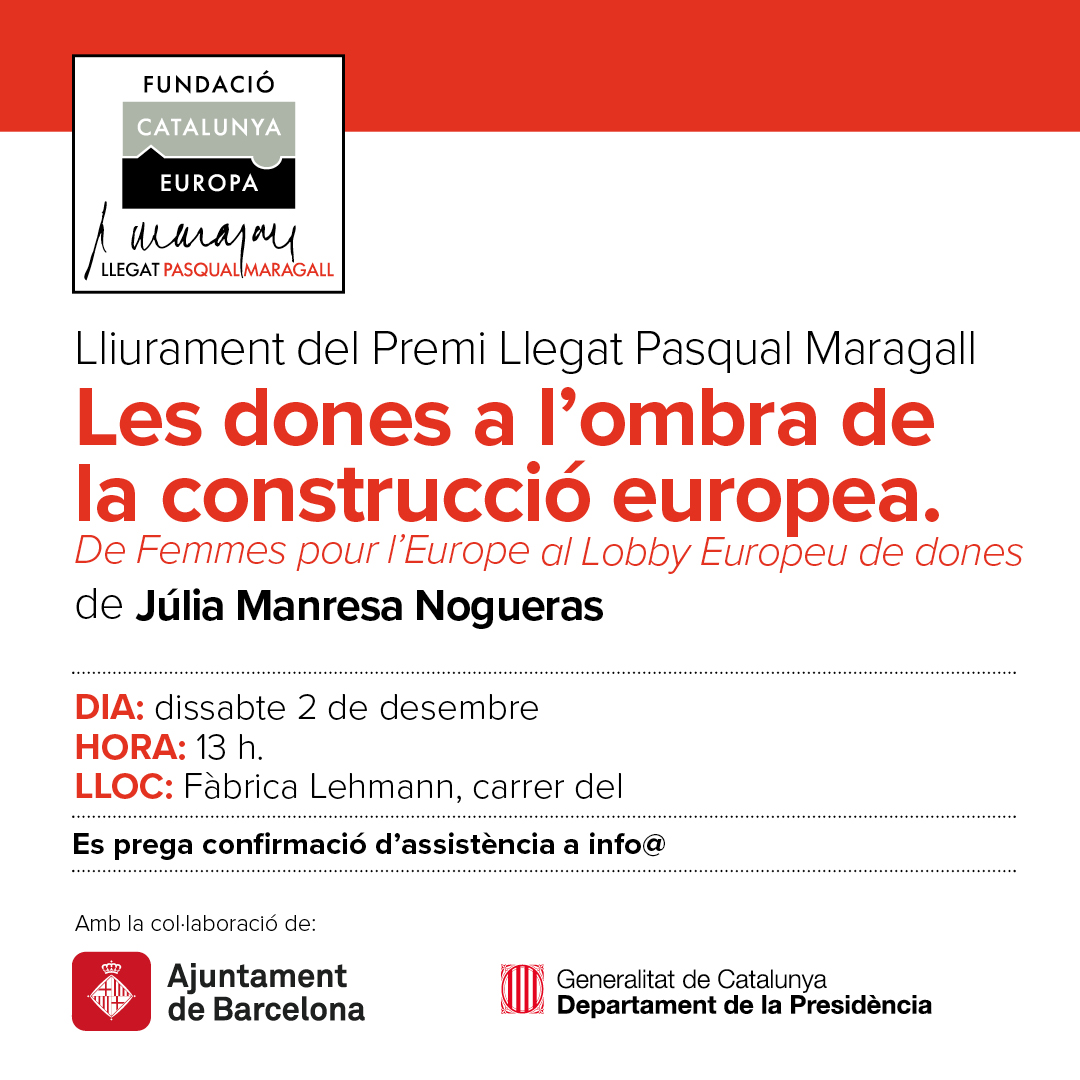Aquest dissabte 2 de desembre s'ha fet l'acte de lliurament dels Premis de Recerca Pasqual Maragall 2022-2023 al treball "Les dones a l'ombra de la construcció europea. De Femmes pour l'Europe al Lobby Europeu de dones" de la periodista Júlia Manresa Nogueras, en la categoria de "Millor Treball Final de grau o de màster".