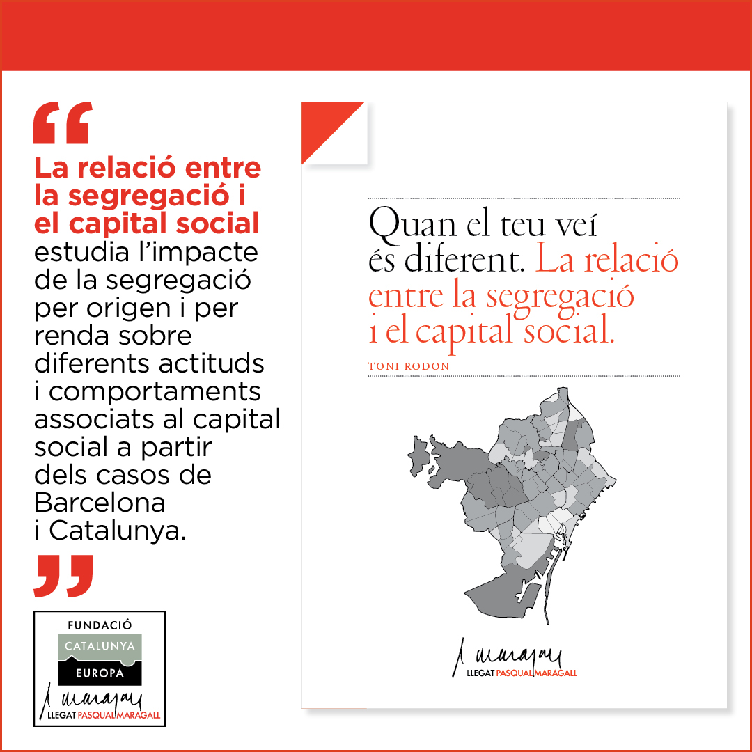 L’estudi de Toni Rodon és una contribució acadèmica al debat sobre la segregació i els seus efectes. Quina relació hi ha entre la segregació, el vot i la participació política? Aquest és un dels punts de partida del treball que analitza l’impacte de la segregació per origen i per renda sobre diferents actituds i comportaments associats al capital social, a partir dels casos de Barcelona i Catalunya.