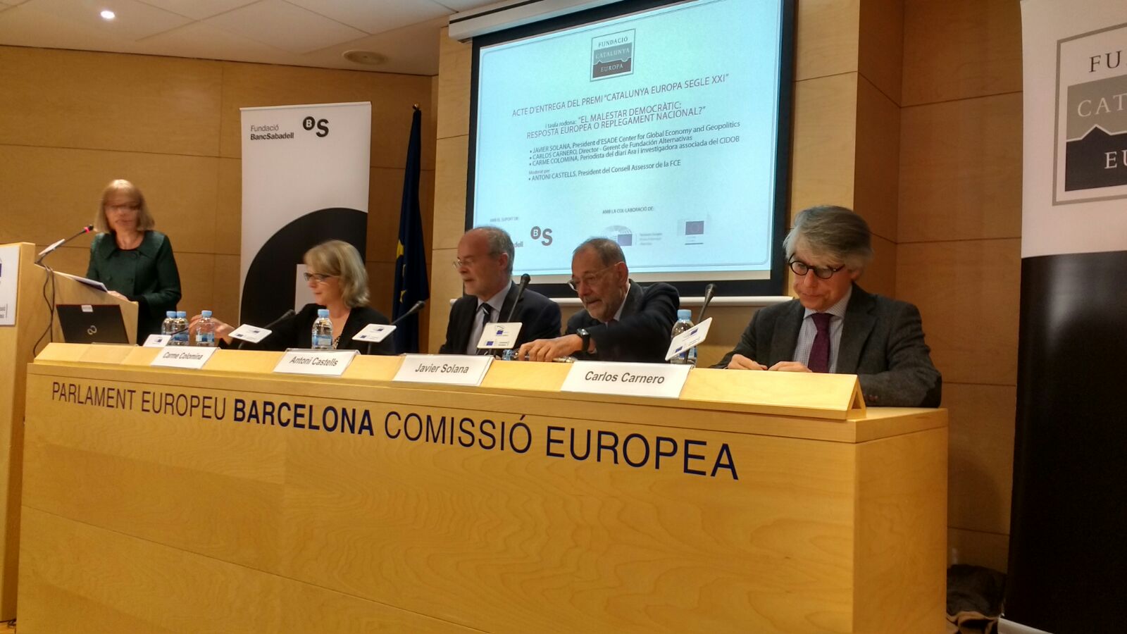 The event -from which you can download the full transcript- also served to organize the debate "The Democratic Upset: European Response or National Reflection?", With Javier Solana, president of ESADE Center for Global Economy and geopolitical; Carlos Carnero, managing director of the Alternativas Foundation; and Carme Colomina, journalist of the ARA newspaper and researcher associated with CIDOB. Both they and the researcher who won the award agreed that the 2014 elections represented an advance in the conversion of the community legislature into an institution similar to the national parliaments. However, there are still many obstacles to overcome. Proof of this are the multiple crises that the community project goes through; and the statements of the speakers.