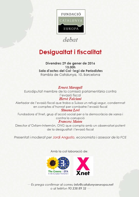 During the question time, the journalist Andreu Missé, present among the public, praised the role of xnet - "Without the work of organizations such as X-Net the judgment of the Supreme Court with Bankia would not have been possible", he said. Among the attendees has arisen the doubt on how the interests of the 28 States of the European Union can be reconciled, when coordinating the fight against tax evasion. Maragall pointed out that it is preferable to go "directly towards a common taxation", towards the establishment of common taxes to finance a "European fund".