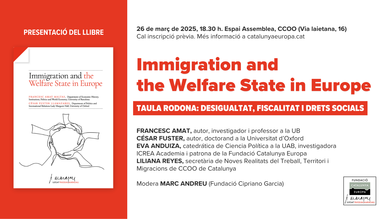 The Fundacio Catalunya Europa will host on 26th March the presentation of the book Immigration and the Welfare State in Europe, a work resulting from the Pasqual Maragall Legacy Award. The event will take place at 18:30 at the Espai Assemblea of CCOO (Via Laietana, Barcelona), in collaboration with CCOO and the Fundació Cipriano Garcia. Prior registration is required.