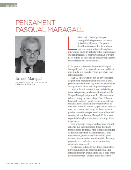 Article of the vice-president of the Fundació Catalunya Europa, Ernest Maragall, presenting the new program that will study Pasqual Maragall's legacy.