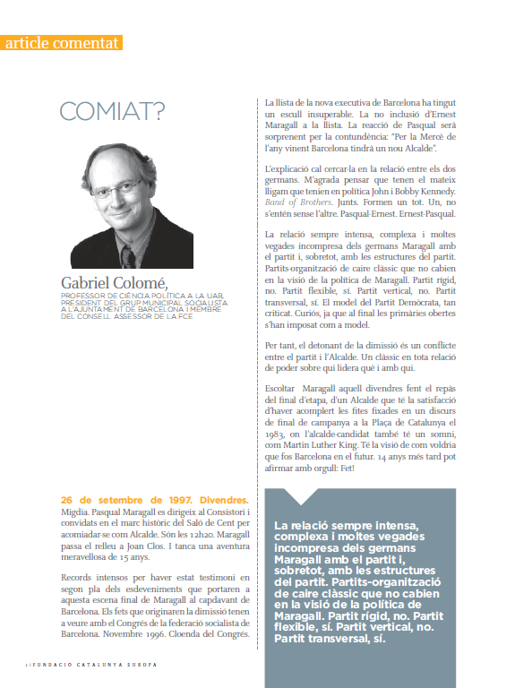 Artículo de opinión de Gabriel Colomé sobre Pasqual Maragall para la newsletter de abril de la Fundación Cataluña Europa. Colomé es Profesor de Ciencia Política en la UAB, Presidente del Grupo Municipal Socialista en el Ayuntamiento de Barcelona y miembro del Consejo Asesor de la FCE.